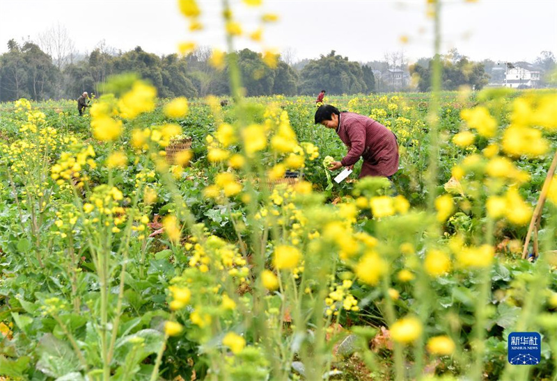 2月9日,四川省广安市广安区花桥镇竹林村的农民在油菜地里砍收套种的青菜头。