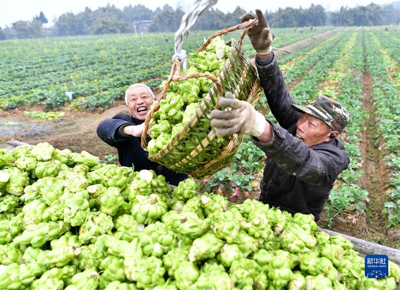 2月9日,四川省广安市广安区花桥镇竹林村的农民将砍收的青菜头装车。
