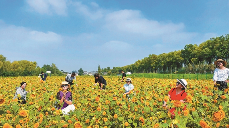 金秋时节,走进扬州市邗江区瓜洲镇瓜洲村,百亩葵园里花浪翻滚,金色花盘迎风摇曳。“国庆期间,我们‘烤乐营’每天都坐满了客人,日营业额稳定在2万元以上。”瓜洲村乡村主理人朱媛难掩喜悦。