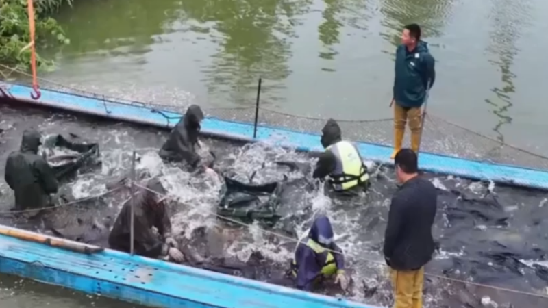 养殖户们撒网捕鱼