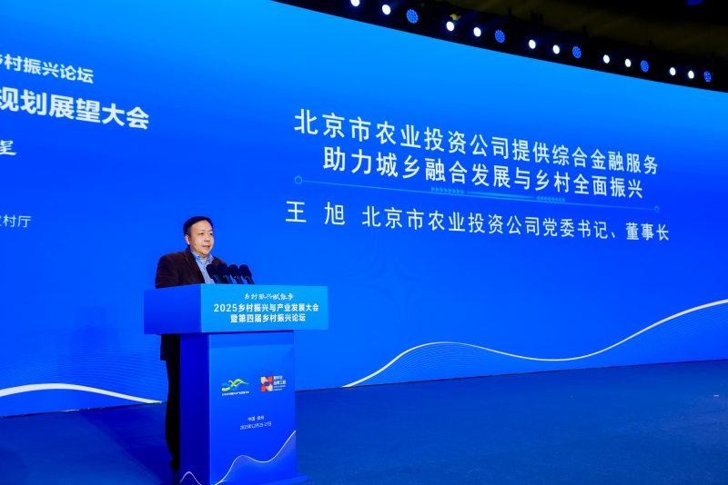 论坛现场,北京市农业投资有限公司党委书记、董事长王旭发表了题为《北京市农业投资公司提供综合金融服务 助力城乡融合发展与乡村全面振兴》的主旨演讲。