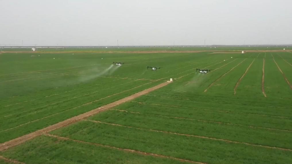 在河南省商丘市梁园区刘口镇,一望无际的麦田长势喜人。在农技专家的指导下,当地正在为小麦进行大规模无人机飞防作业。